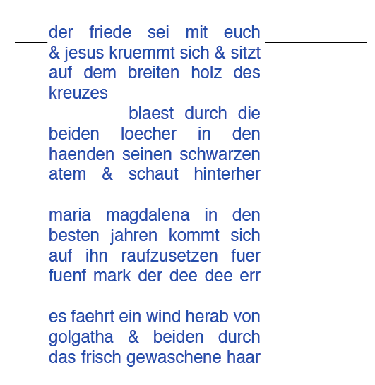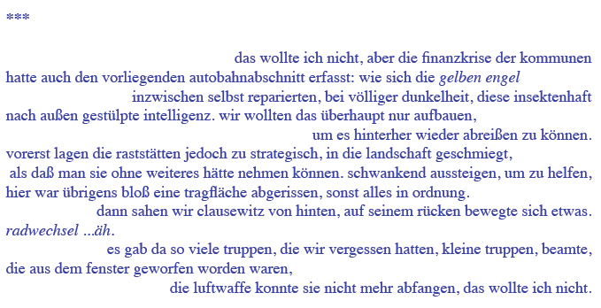 arrgh. die geometrie dieser ratte, harte fügung. darf das die grammatik? sie entlehnt sich. wo hatte ich das nur gelesen? angstbelastete formen, jaja. es grollt. ein rollender reiter. ein bote. am teich aber die einfalt und der schatten des aufgezogenen buschwerks. ich muß wieder fragen: die grammatik, sie darf? sie darf das so fügen? es grollt, als ob krieg wär, wahrscheinlich feiert sich jemand. der rollende reiter ist nicht zu verstehn, am teich vibrieren die kreise im kreis ihrer einfalt. „so war das“, sagt die grammatik. das heißt implizit: so ist es nicht mehr. ich will nur ein einziges mal ohne sie sprechen, denn ich, in meiner rattigen einfalt, wollte doch eben noch einiges mehr. „ist das nicht eher entlegen?“, fragt die grammatik. sie darf.