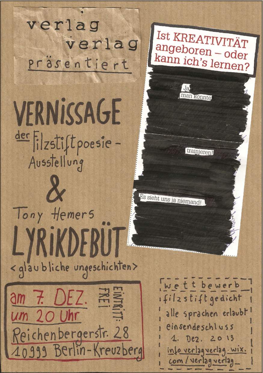 Sehen Sie auch den Aufruf zum Wettbewerb: Filzstiftpoesie in der Grafik (alle Sprachen erlaubt, Einsendeschluß 1.12.)
