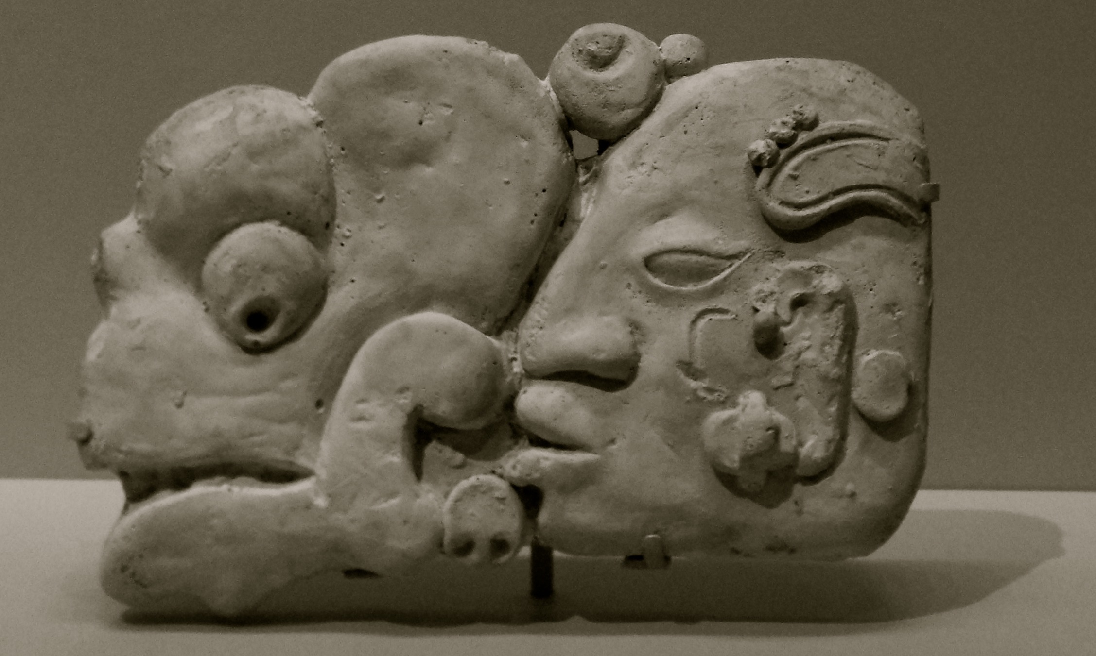 Maya-Glyphenblock mit Textfragment, Bellote, Mexiko, ca. 650 u.Z. Die Maya entwickelten das raffinierteste Schriftsystem Amerikas. Als die Spanier ihr Land in Besitz nahmen, verboten sie den Gebrauch der Schrift. Katholische Eiferer verbrannten viele Papierbücher, aber auf Steindenkmälern, Gebäuden und Keramiken blieben gemalte oder wie hier geschnitzte Zeugnisse ihrer Hieroglyphenschrift übrig. Dieser Block gehörte offenbar zu einer Inschrift an einem Gebäude. Quelle: National Museum of the American Indian, New York.