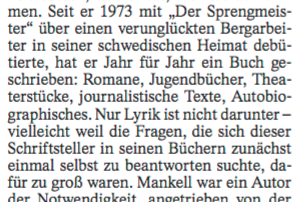 Der Nachruf auf Henning Mankell stand in der FAZ von gestern, Seite 9.