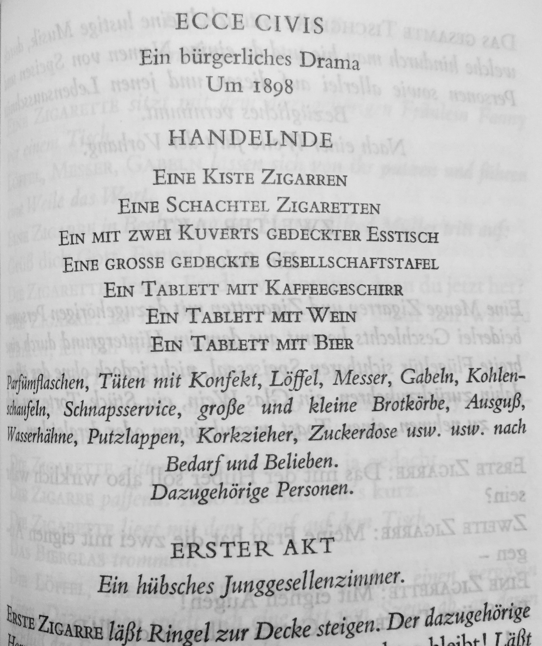 Ein hübsches Junggesellenzimmer mag auch der Ort der Erstaufführung gewesen sein. Aber wieso Ulk? Ich sehe es vor mir. Erste Zigarre: läßt Ringel zur Decke steigen. Mehrere Teller: klappern. Gabeln: klirren. Eine Zigarette: fängt an zu brennen. Der erste Akt endet so: „DAS GESAMTE TISCHGERÄT entwickelt eine lustige Musik, durch welche hindurch man hie und da einige Namen von Speisen und Personen sowie allerlei auf diesen und jenen Lebensausschnitt bezügliches vernimmt. Nach einer Weile fällt der Vorhang.“ Lange vor der bruitistischen Musik der Futuristen und dem bruitistischen Krippenspiel des Hugo Ball hat Christian Morgenstern die Chose erfunden. Und erstaufgeführt wurde es in Greifswald, Straße der Freundschaft.