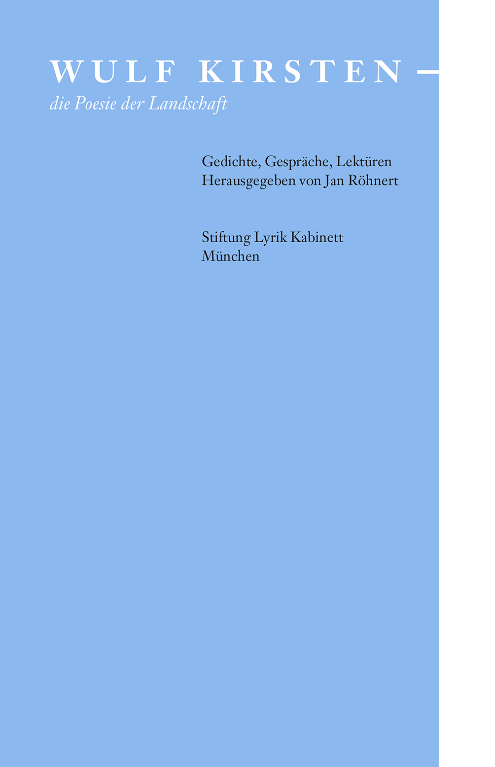 Die Stiftung Lyrik Kabinett widmet dem auf der „Erde bei Meißen“ geborenen Dichter Wulf Kirsten einen Band in der Reihe ihrer blauen Bücher: Er enthält neue Gedichte von Kirsten, ein ausführliches Interview und elf Lektüren dieses „Klassikers der Gegenwart“. Die Beiträge öffnen unvorhergesehene Perspektiven auf ein facettenreiches, in über 50 Jahren Autorschaft gewachsenes lyrisches Œuvre, das gleichwohl wie eine lange Erzählung einem roten Faden folgt – dem der Landschaft. Eine Lyrik von elementaren Dimensionen, die gleichwohl mitten in der Gegenwart ihren Standort behauptet, sei es in Jean Gionos Provence, sei es unter den Botanikern, den Ornithologen, in Luthers Bibel, der Bibliothek oder in der Verwandtschaft Hölderlins und Annette von Droste-Hülshoffs. Jenseits der Moden des Literaturbetriebs gehört Kirstens „Sprache, in der man sich verproviantieren kann gegen Geschwindigkeit, Anpassung, Verlust“ (Martin Walser) zum wahrhaft Bleibenden, was die deutschsprachige Poesie der letzten Jahrzehnte hervorgebracht hat.