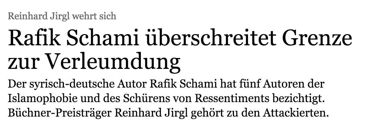 Danach kann ich ja etwas zu Jirgl sagen, wenn Sie darüber nichts sagen wollen: Schon die Tatsache, dass er nur so beleidigt „mimimimimi“ macht, und die eigentliche Unverschämtheit Schamis, die gar nicht ihn, sondern eigentlich alle trifft, nämlich die Gleichsetzung von Islamophobie und Antisemitismus, überhaupt nicht kommentiert, ist von empörender Dummheit, was aber – wenn man Jirgls sonstige wenig reflektierte Bemerkungen in Bezug auf tagespolitische Ereignisse in den letzten Monaten im Kopf hat – leider nicht mehr überrascht.