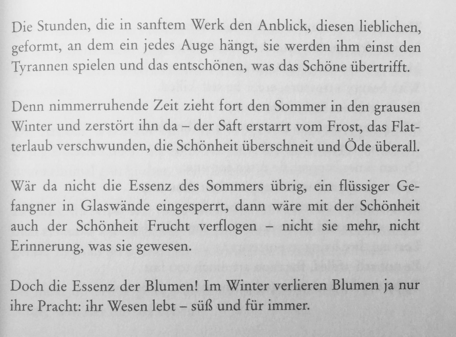 Dieselben Stunden, die so hold dein Bild Zur Augenlust geschmückt mit zartem Kleid, Sind bald tyrannisch wider dich gewillt, Unhold verkehrend die Holdseligkeit. Denn nimmermüde Zeit führt Sommers Blühn Zum eklen Winter fort in blinde Schmach: Frost hemmt den Saft, es welkt all frisches Grün, Die Schönheit liegt verschneit, die Welt liegt brach. Und bliebe nicht des Sommers Quintessenz, Ein flüssiger Häftling gläsernem Gewänd, Stürb aller Schönheit Sinn mit ihrem Lenz, Daß sich auch nicht ein Angedenken fänd. Nur Blumen-Aufguß wahrt zur Winterszeit Zwar nicht die Schau, doch Wesens Süßigkeit.