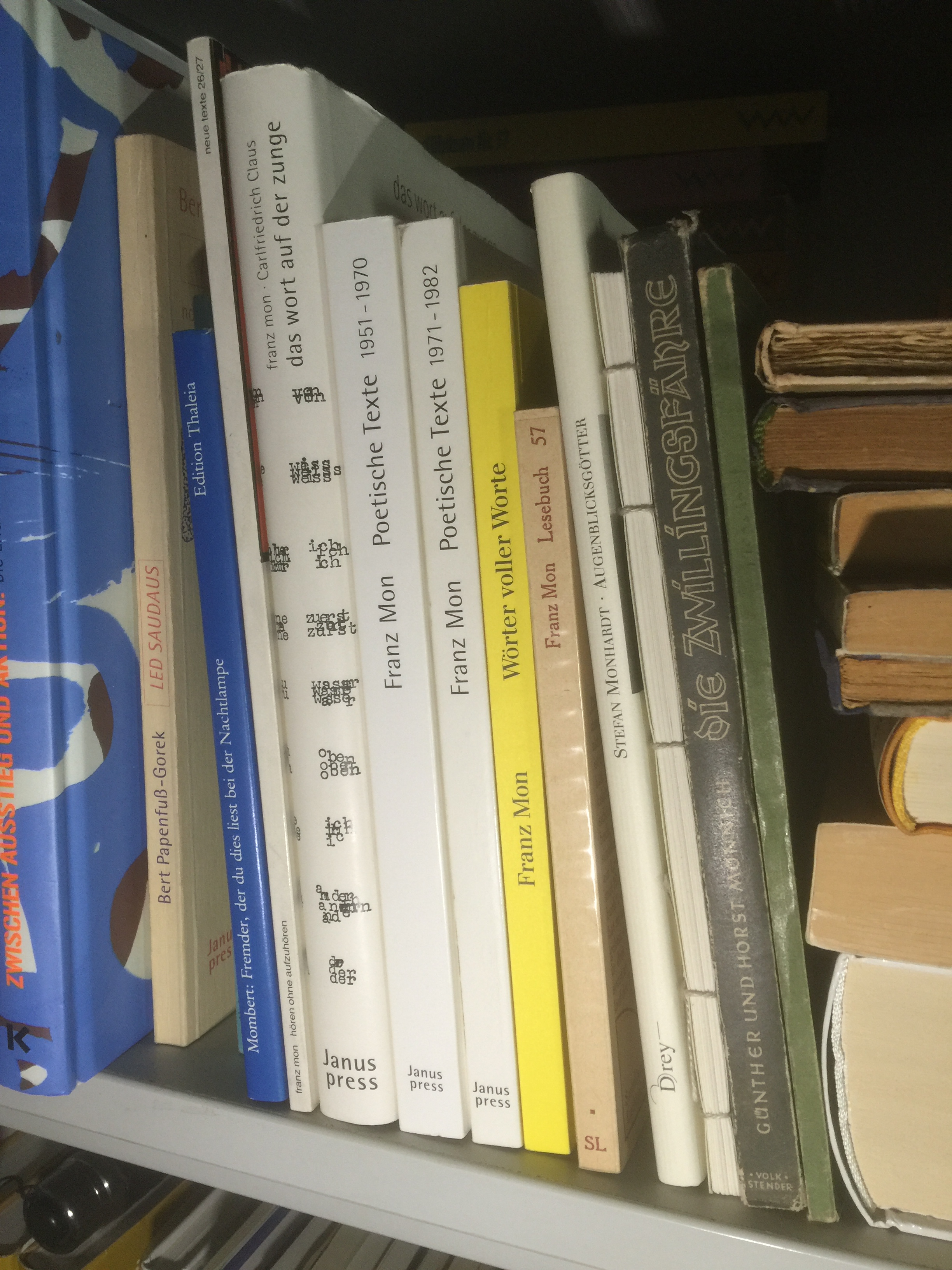 Herrje, das ist ja das reinste Chaos im Bücherregal (jedenfalls vor Mombert, danach geht’s ja wieder alphabetisch weiter…)
