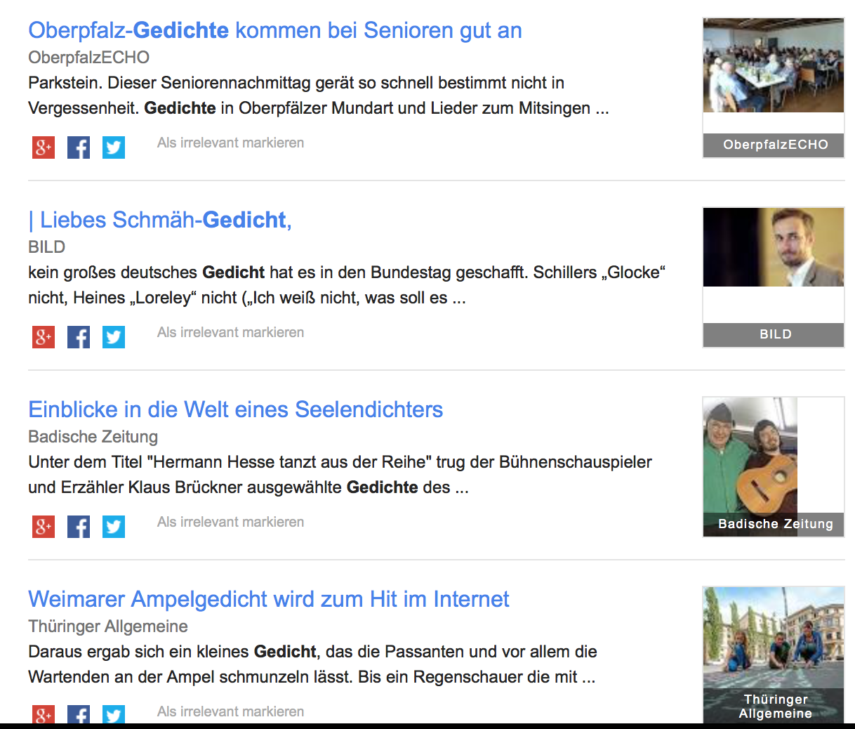 Ein Google-Alert, heute 3:02 Uhr in meinem Postfach, zeigt, in welchem Grad Deutschland von Gedichten durchwabert ist. Von der Pfalz bis hin nach Weimar, von der Spree bis an den Rhein alle Milieus mit Gedichten befaßt: