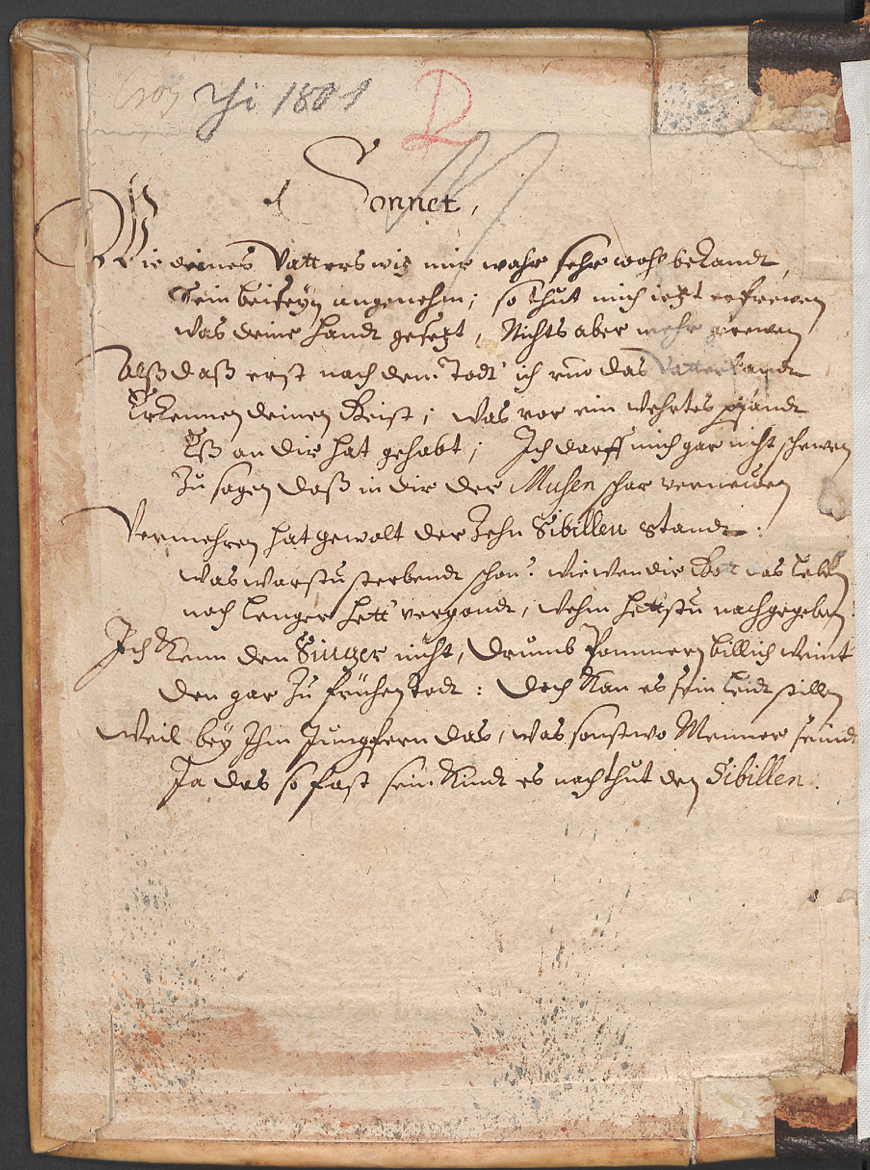 Im Berliner Exemplar der Gedichte von Sibylla Schwarz (1621-1638) im ersten Band (1650) auf dem Innendeckel findet sich folgendes Sonnet in Schönschrift: