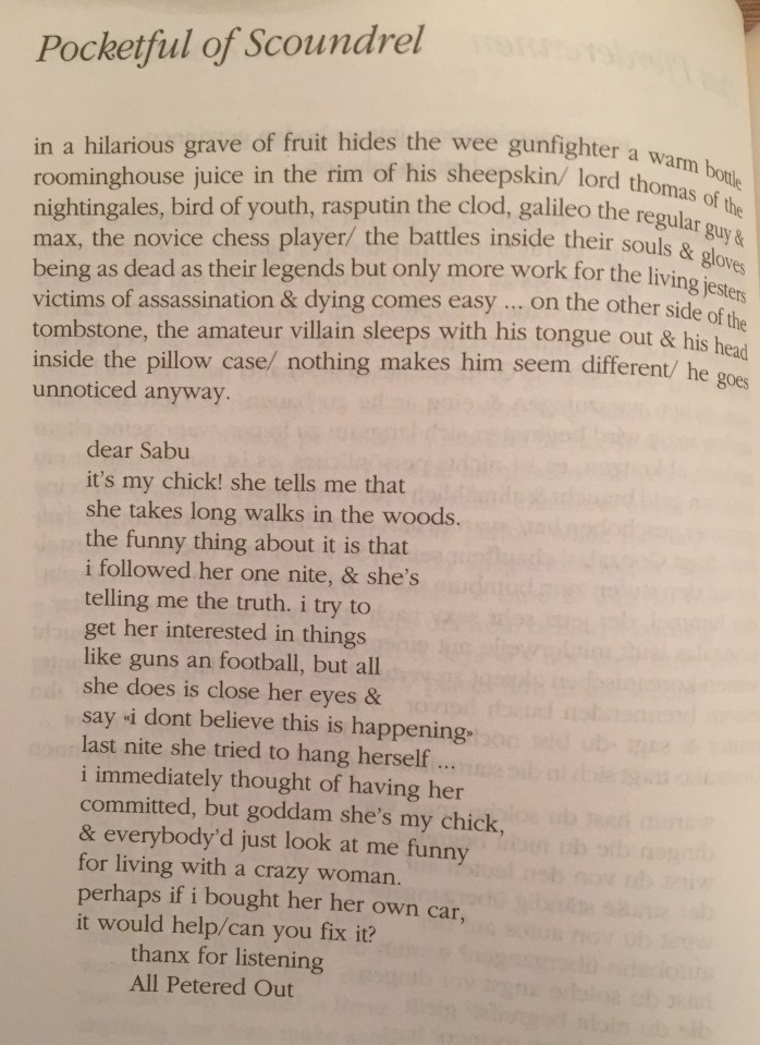 *) Prose poetry? Okay, kann man gelten lassen. Aus: Bob Dylan: Tarantula / Tarantel. Aus dem Amerikanischen von Carl Weissner. Zweisprachig. Frankfurt/Main: Zweitausendeins, 1976 (Neuaufl. Hannibal Verl., 1995)