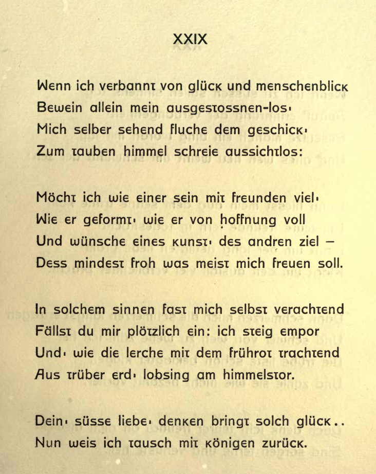 Leseecke ist eine Rubrik, die sich langsam, Stück für Stück der digitalen Veröffentlichung aller 154 Sonette Shakespeares in Günter Plessows Übersetzung und dem Originaltext (im Jubiläumsjahr 2016 bei Signaturen) anschließt und hier Leseecke und Forum zur Diskussion über die Sonette und / oder Übersetzungen sein kann. Jedenfalls ich werde an 154 Tagen (mit Zwischenraum, um durchzuschaun) mir jeweils eins der Sonette vornehmen und hier den Originaltext und zusätzliches Material anbieten. Einladung zum Pendeln von Shakespeare zu Plessow und zurück (wenns sein muß auf Umwegen über Schlegel/Tieck, Bodenstedt, George, Kraus & Co). (Die Zahl neben dem Wort Leseecke ist die Nummer des Shakespearesonetts). Zur Originalschreibweise: u / v und i / j sind fast regellos austauschbar, liue lies live, ioy lies joy.
