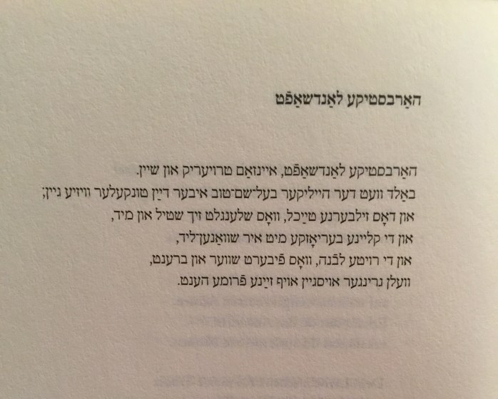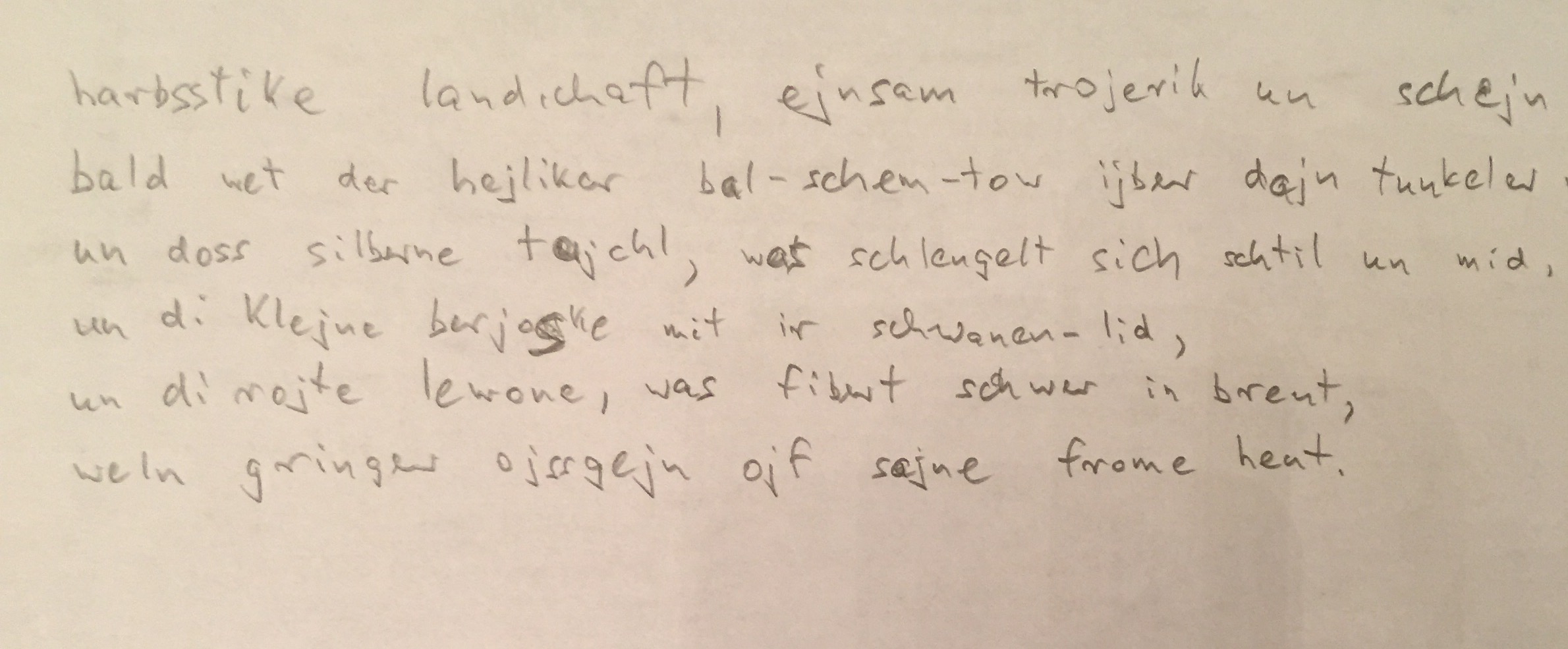 harbsstike landschaft harbsstike landschaft, ejnsam trojerik un schejn. bald wet der hejliker Bal-Schem-Tow iber dajn tunkeler wisje gejn un doss silberne tajchl, was schlengelt sich schtil un mid, un di klejne berjoske mit ir schwanen-lid, un di rojte lewone, was fibert schwer in brent, weln gringer ojssgejn ojf sajne frome hent.