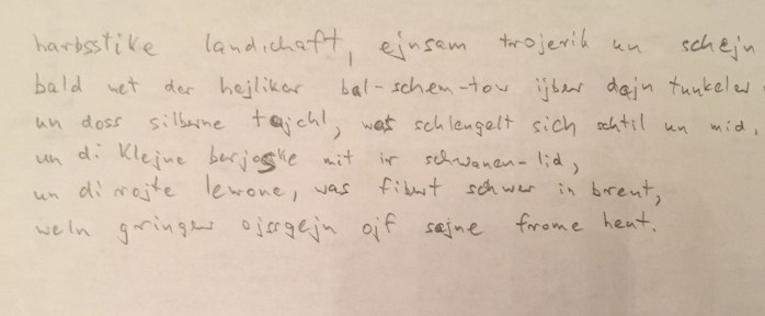 Ein Sommergedicht von Itzik Manger kenne ich nicht, dafür mehrere Herbstgedichte. In dem zweisprachigen Band „Dunkelgold“ (Tunklgold / טונקל-גאלד) stehen die Gedichte im jiddischen Original und in der deutschen Übersetzung von Efrat Gal-Ed einander gegenüber. Zusätzlich gibt es im Anhang die Transkription der hebräischen Buchstaben. Ich kann ein bißchen Jiddisch und hab dafür die hebräische Schrift geübt. Im Faksimile unten eine Transkriptionsübung (die überschriebenen Stellen meiner Bleistiftschrift sind die nachräglichen Korrekturen anhand der transkribierten Fassung aus dem Buch).
