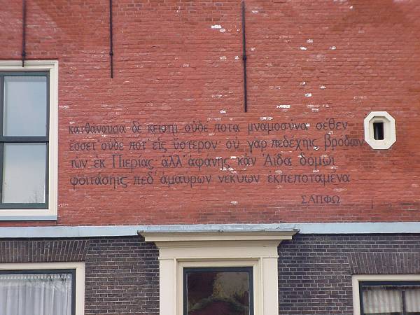 In Leiden gibt es über 100 Gedichte auf Hauswänden, viele davon in fremden Sprachen wie Russisch, Japanisch, Hebräisch, Deutsch, Französisch, Neugriechisch und eben auch Altgriechisch. Da braucht man viele Semesterpausen*, um die alle auszuforschen.