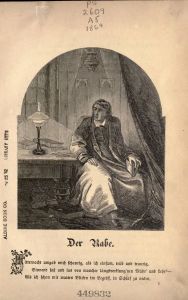 Die Ähnlichkeit ist nicht ganz zufällig. Es ist ein berühmtes Gedicht, kein modernes Gedicht, aber doch ein Markstein in der Geschichte der modernen Lyrik. Poe nämlich beschrieb in einem Aufsatz die (angebliche) Entstehungsgeschichte. Charles Baudelaire war beeindruckt – der Aufsatz beschreibt in gewisser Weise einen von zwei Strömen, die zur modernen Lyrik führten und in Baudelaire vereint waren: das Gedicht als quasi wissenschaftliche Konstruktion aus dem Labor des Dichter-Laboranten. (Der andere Strom war das geträumte oder halluzinierte Gedicht, wofür Samuel Taylor Coleridges Gedicht Kubla Khan steht, für das sein Autor ebenfalls eine legendäre (wohl eher fiktive) Entstehungsgeschichte schrieb. Dazu hier ein andermal). Der Aufsatz Poes trägt den Titel The Philosophy of Composition. Hier englisch und hier deutsch. Und hier Baudelaires Übersetzung des Gedichts – in Prosa.