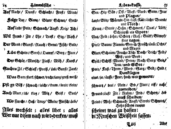 Libt Schein / Stroh / Dampf / Berg / Flutt / Glutt / Schaum / Frucht / Asch / Dach / Teich / Feld / Wiß / und Brod: