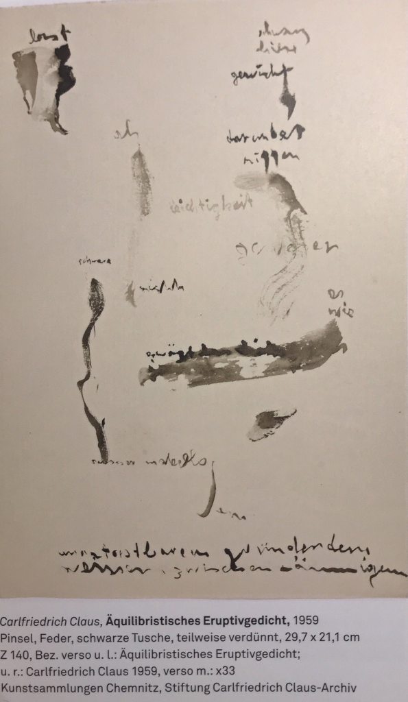 Aus: Ingrid Mössinger, Brigitta Milde (Hrsg.): … eine nahezu lautlose Schwingungs-Symbiose. Die Künstlerfreundschaft zwischen Franz Mon und Carlfriedrich Claus. Briefwechsel 1959–1997. Visuelle Texte. Sprachblätter. Kunstsammlungen Chemnitz. Kerber-Verlag Bielefeld/Berlin 2013, S. 47