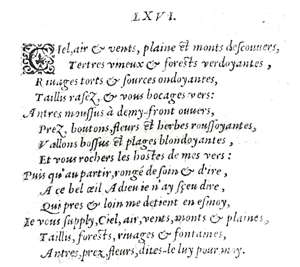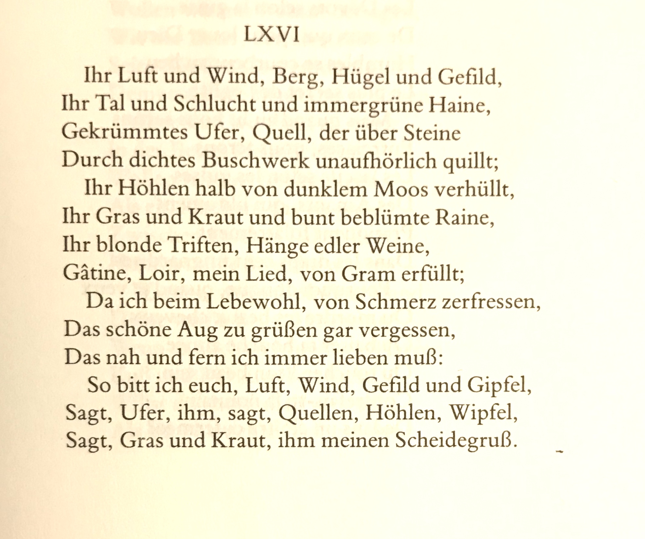 Sonnet XXXIV. JHr / Himmel / lufft vnd wind / jhr hügel voll von schatten / Jhr Hainen / jhr Gepüsch' / vnnd du / du edler Wein / Jhr frischen Brunnen jhr so reich am Wasser seyn / Jhr Wüsten die jhr stets müßt an der Sonnen braten / Jhr durch den Weissen thaw bereifften schönen Saaten / Jhr Hölen voller Moß / jhr auffgeritzten Stein' / Jhr Felder welche ziert der zarten Blumen Schein / Jhr Felsen wo die Reim' am besten mir gerathen / Weil ich ja Flavien / daß ich noch nie thun können / Muß geben gute Nacht vnd gleichwohl Muth vnd sinnen Sich fürchten allezeit vnd weichen hinter sich / So bitt' ich Himmel / Lüfft / Wind / Hügel / Hainen / Wälder / Wein / Brunnen / Wüsteney / Saat / Hölen / Steine / Felder / Vnd Felsen sagt es jhr / sagt / sagt es jhr vor mich.