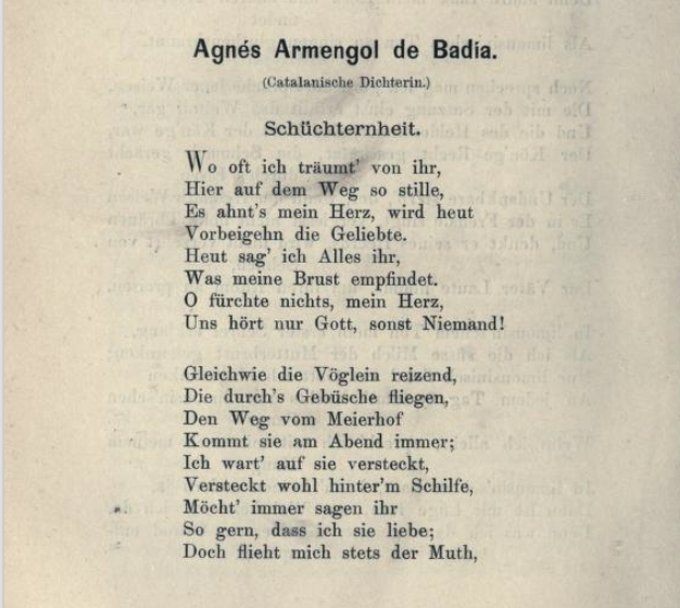 Aus: Catalanische Troubadoure der Gegenwart : Verdeutscht mit einer Uebersicht der catalanischen Literature eingeleitet von Johannes Fastenrath. Leipzig: Carl Reissner, 1890, S. 8f