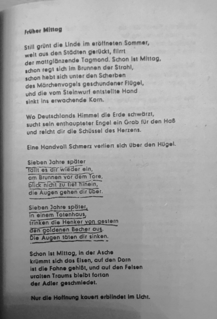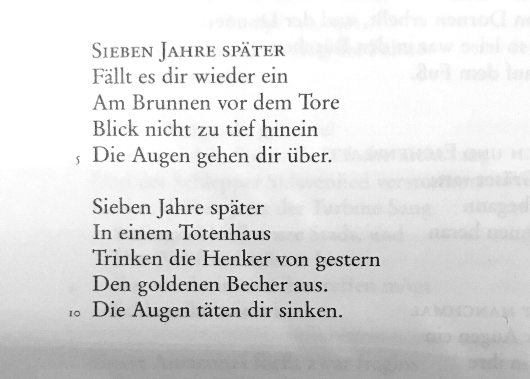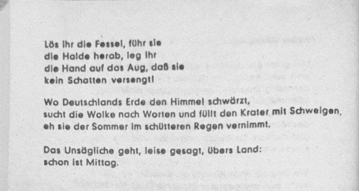 1953 oder 1954 bekam Brecht den ersten Gedichtband der jungen Dichterin Ingeborg Bachmann geschenkt. Er las mit Bleistift und machte daraus durch radikale Kürzung „eigene“, der lakonischen Art seines Spätwerks entsprechende Gedichte.