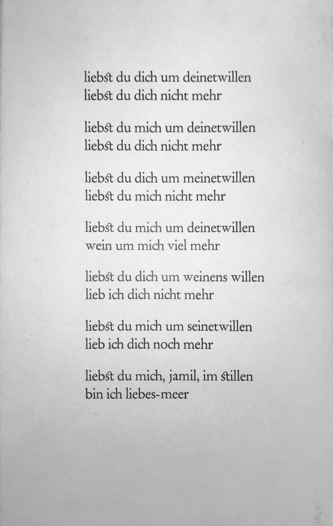 Aus: hadayatullah hübsch: liebe. gedichte. Originalminiaturen von Anne-Kristin Schaller. Düsseldorf: Eremiten, 1983, S. 11