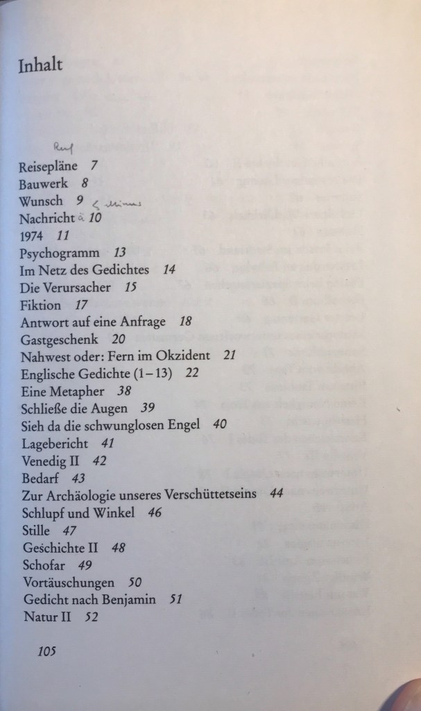 Kurz nach Erscheinen der Westausgabe (die eigentlich eine Lizenzausgabe des DDR-Verlages war) schickte mir ein dänischer Bekannter (hallo Nils!) das Buch. Es kam nicht an, dafür ein Brief vom „Zollamt“ der DDR, der mir mitteilte, dass ein „nicht einfuhrfähiges“ Buch leider an den Absender zurückgeschickt werden müsse (sagt meine Erinnerung, vielleicht auch „einbehalten“?). Ich hatte die Chuzpe, dem Amt zu antworten, dass mir bekannt sei, dass das Buch auch beim Aufbau-Verlag erscheinen werde (ich hatte die Ankündigung im „Vorankündigungsdienst“ des DDR-Buchhandels-Börsenblattes gelesen, gab es wirklich!)*. Das Amt antwortete: Meine Aussage, dass es auch in der DDR erscheinen würde, habe sich nicht bestätigt. Kunststück, die Zensur zögerte es noch bis 1980 hinaus. Ich setzte mich später mit meiner Ostausgabe in den Lesesaal der Deutschen Bücherei in Leipzig und verglich die Ausgaben. Fünf Gedichte der Hanserausgabe fehlten mir, ich schrieb sie mir ab und legte sie ins Buch, so ging es manchmal. Auch die Anzeige aus dem DDR-Börsenblatt liegt im Buch. Meine Adresse steht drauf: also habe ich es in einer Buchhandlung bestellt und dann auch bekommen, gekürzt halt. Statt „Etwa 120 S.“ waren es nur 108.