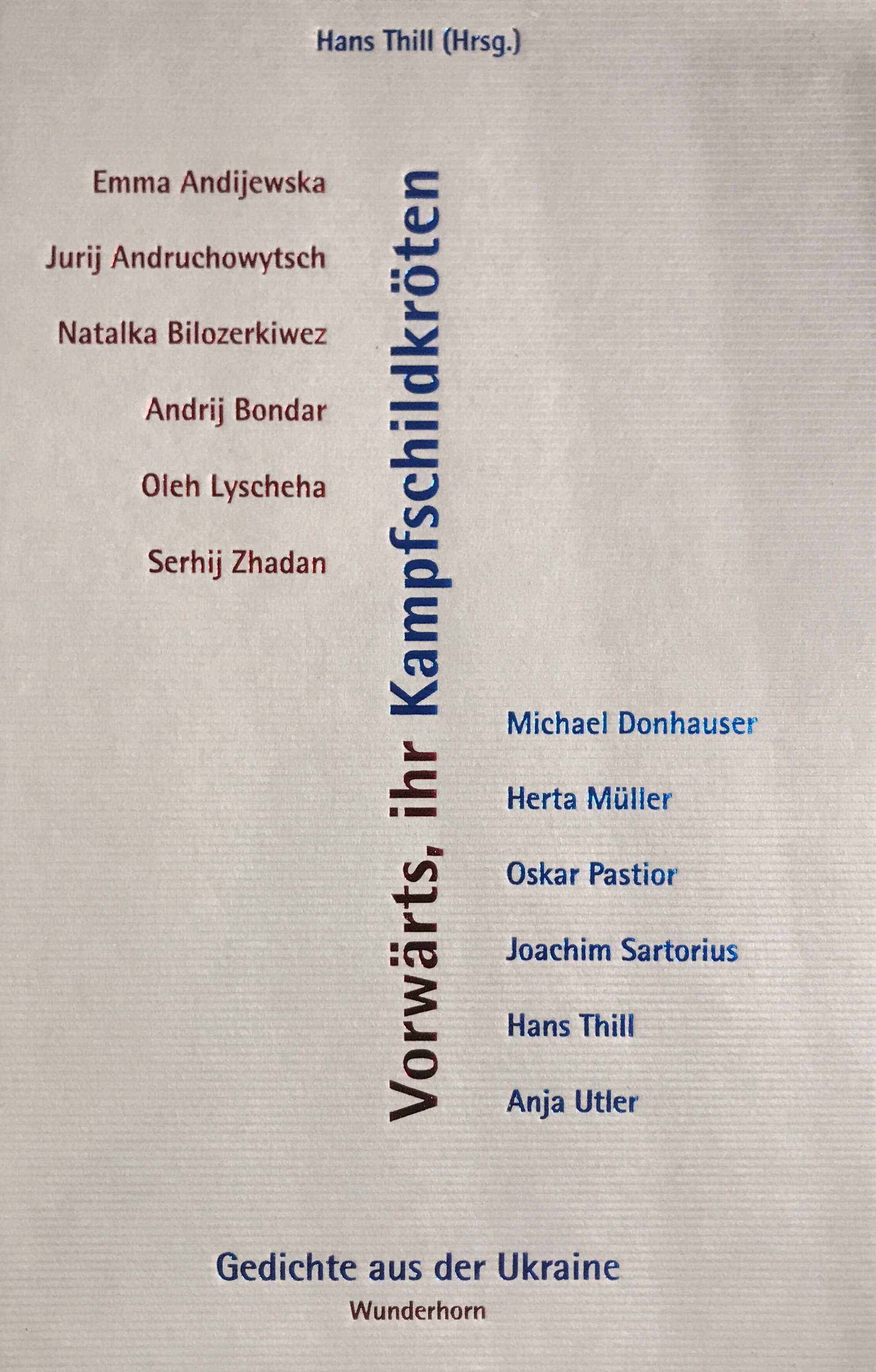 Hans Thill (Hrsg.): Vorwärts, ihr Kampfschildkröten. Gedichte aus der Ukraine. Zweisprachige Ausgabe ukrainisch-deutsch. Heidelberg: Wunderhorn, 2006. – 188 Seiten, Format: 13.5 x 21 cm, gebunden, mit Lesebändchen, bibliophile Ausstattung | ISBN: 978-3-88423-259-0 Mehr