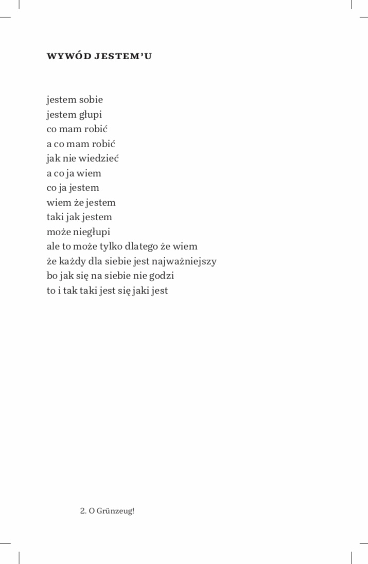 Aus: Miron Białoszewski, Wir Seesterne. Gedichte. Polnisch und deutsch. Übersetzt u. hrsg. v. Dagmara Kraus. Leipzig: Reinecke & Voß, 2012, S. 60f