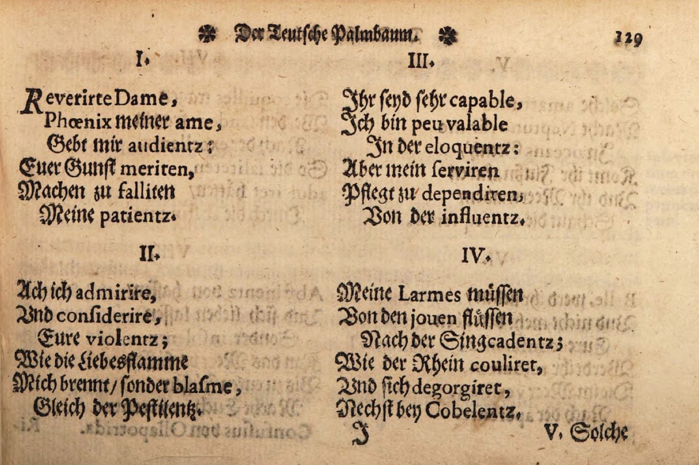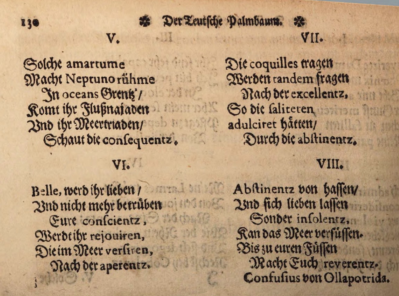 Aus: Der Teutsche Palmenbaum: Das ist, Lobschrift Von der Hochlöblichen, Fruchtbringenden Gesellschaft : Anfang, Satzungen, Vorhaben, Namen, Sprüchen, Gemählen, Schriften und unverwelklichem Tugendruhm. Allen Liebhabern der Teutschen Sprache zu dienlicher Nachrichtung, verfasset durch den Unverdrossenen. Nürnberg 1647, S. 129f