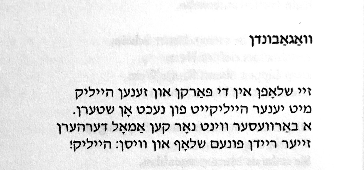 Aus dem Jiddischen von Andrej Jendrusch. Aus: Itzik Manger: Ich, der Troubadour. Lieder, Balladen und Prosa. Berlin: Edition Dodo, 1999, S. 53