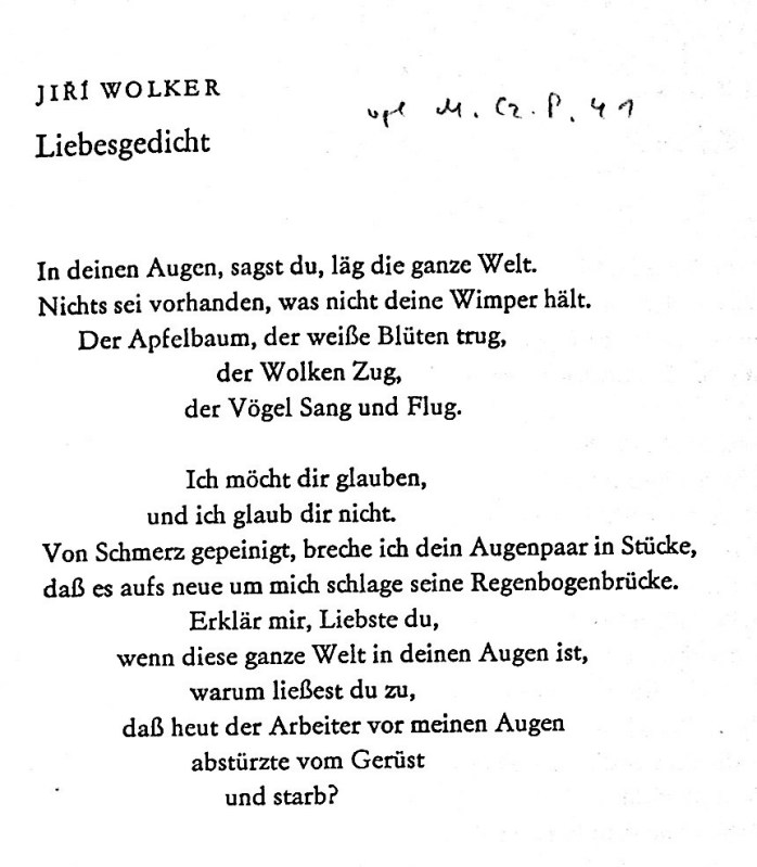 Deutsch von Wilhelm Tkaczyk, aus: Die Glasträne. Tschechische Gedichte des 20. Jahrhunderts. Berlin: Volk und Welt, 1966, S. 105