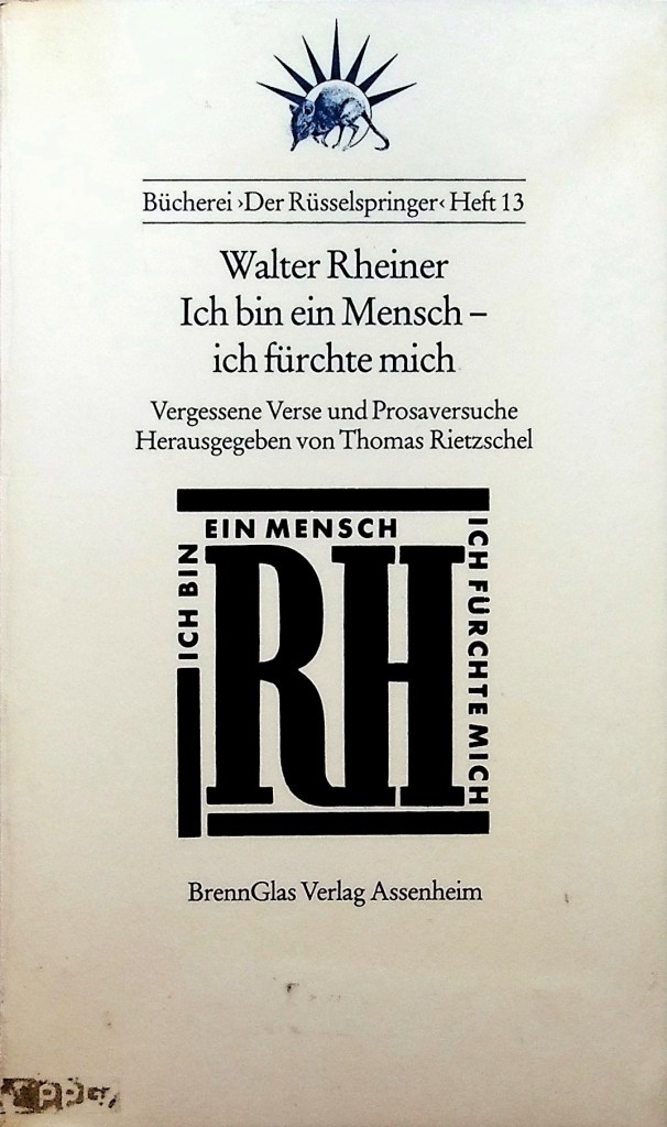 Aus: Walter Rheiner, Ich bin ein Mensch – ich fürchte mich. Vergessene Verse und Prosaversuche. Herausgegeben von Thomas Rietzschel. BrennGlas Verlag Assenheim, 1986, S. 50f