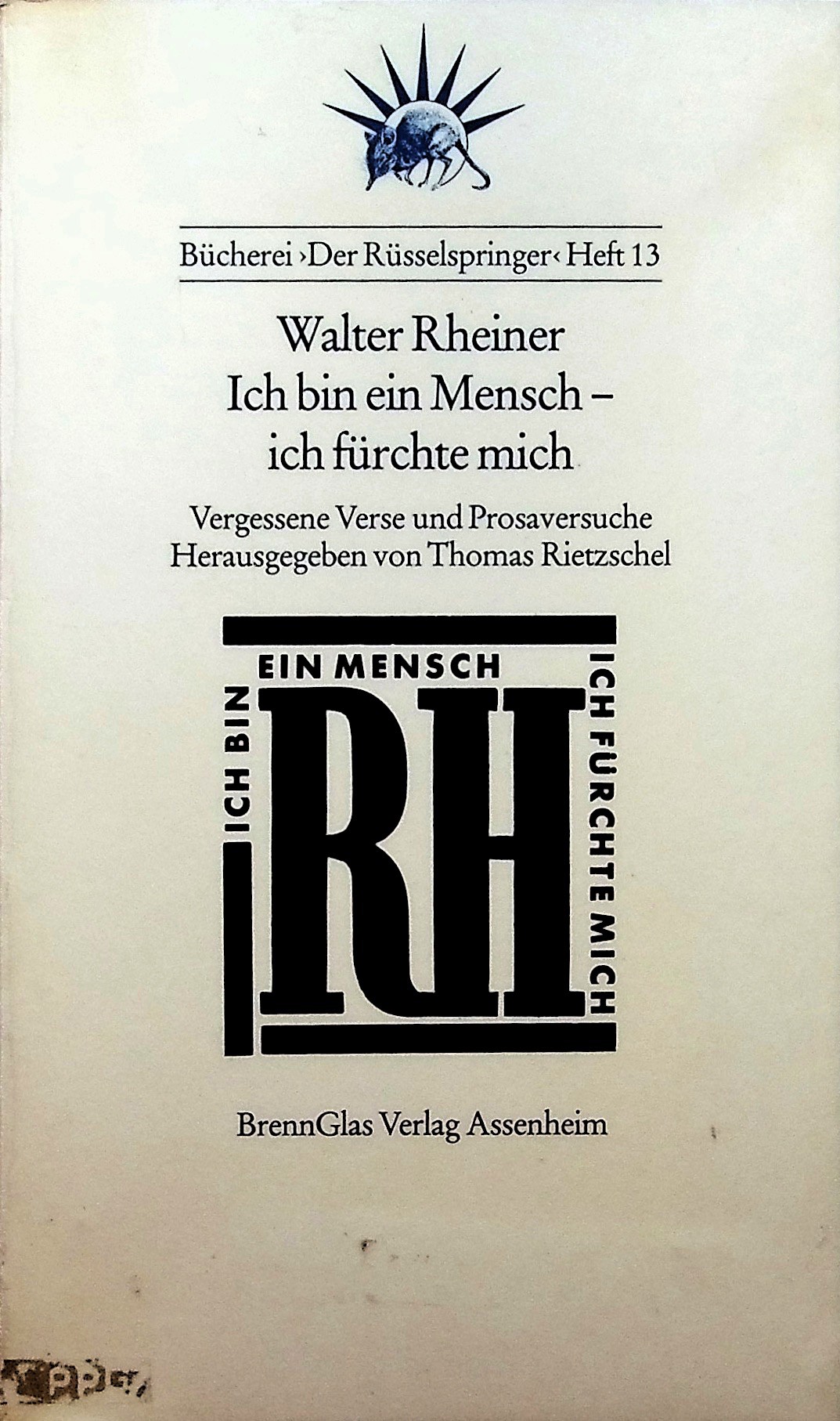 Aus: Walter Rheiner, Ich bin ein Mensch – ich fürchte mich. Vergessene Verse und Prosaversuche. Herausgegeben von Thomas Rietzschel. BrennGlas Verlag Assenheim, 1986, S. 50f