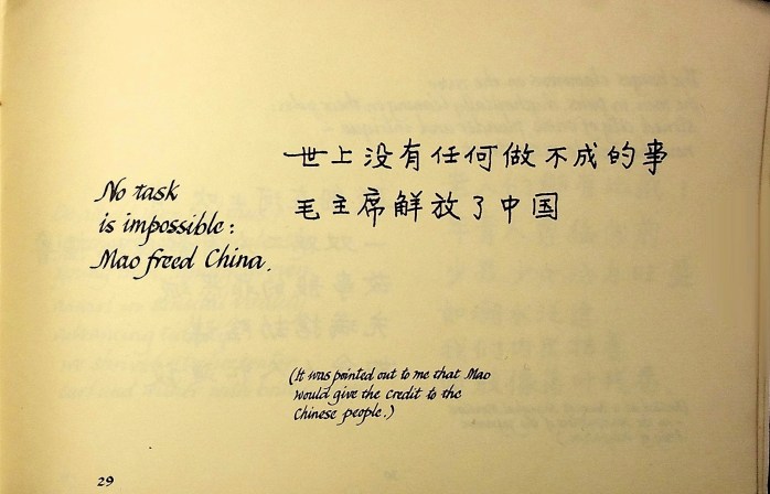 Interessanterweise scheint die chinesische Übersetzung des englischen Originals viel wortreicher als dieses. Vermutlich hat der chinesische Übersetzer dem – vielleicht mißverständlichen – lakonischen Texte kommentierende Zusätze mitgegeben. – Ich gebe zu, der Scanner hat die englische Handschrift noch schlechter verstanden, er erkannte nicht einmal das Wort Mao.