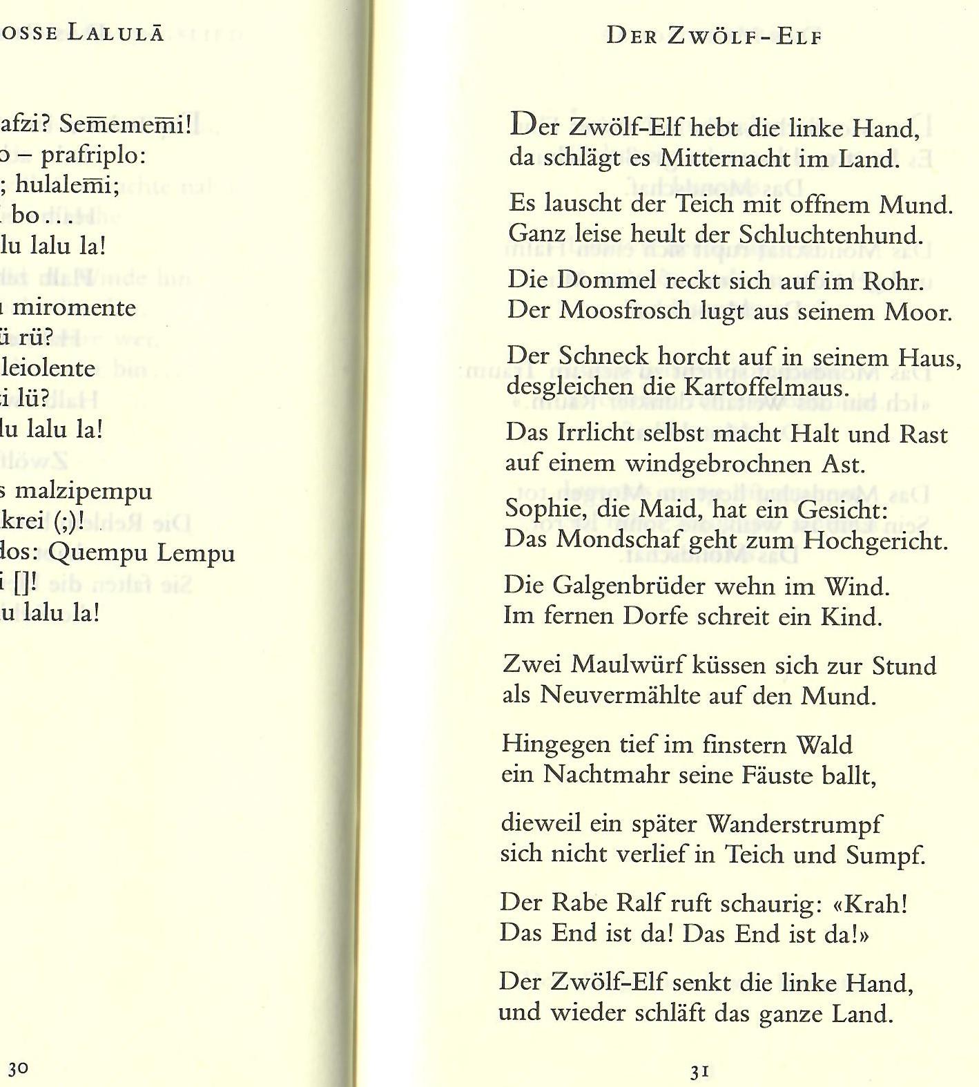 Das Formzitat ist die Elegie; der Ton ist nicht threnetisch; es ist vielmehr, die Form, die mystifiziert und wird, die als beständige Metamorphose beschrieben. Zum Begriff des Wanderstrumpfs findet sich der Eintrag „Also vielleicht ein weibliches Wesen“, gemeint ist, soweit ich sehe, der „Schwarzelf oder -elb“. Morgenstern hat in hellsichtiger Weise die Vereinnahmungsversuche einer mystifizierenden Pseudo-Germanistik vorausgeahnt, und dieses Dunkelmännertum als das gebrandtmarkt, was es im Grunde ist: neckisch, und der bildungsphiliströse Kritikaster, der neckisch redet, hört auf den Namen Nikisch. Ist harmlos gegenüber jeder Kunst, die nicht Erbauung zum Ziel hat, also nicht Religion ist, oder eine Tarnform davon: Kunstreligion. Der Zwölf-Elf Er verspottet die Mystifizierer und Priester. Besonders reizvoll ist der Zwölf-Elf für mich aufgrund der Thematisierung des wirkungsvollen Vortrags von Dichtung, das Ganze folgt der These: Poesie ist nicht Rhetorik. Und es gibt keine Fortschritte, keine Beschulungsmöglichkeiten für Dichter, nur Zyklen und Glück bzw. Schicksal. Ein anderer Sohn Münchens und eines NS-Rasseforschers hat das auf die nicht weiter zu versimpelnde Allerweltsformel gebracht: „Dichten lässt sich nicht unterrichten!“ – Klar, wer holt sich auch die Konkurrenz ins eigene Haus … Du kennst „Texas – Doc Snyder hält die Welt in Atem“? Vom Zwölf-Elf sind da gerade noch übrig die „drei lustigen Zwei“ … Helge Schneider tut derzeit übrigens das einzig Schräge: Er tritt nicht mehr auf, weder live noch vermittelt, bis die Maßnahmen eingestellt werden, die eine erhöhte Regierbarkeit der Schutzbefohlenen herbeiführen sollen. Die Staatsdichter*innen tun ja gerade alles, um die Verunmöglichung von Live, und das damit verbundene Skandalon, zu vertuschen: „Und wieder schläft das ganze Land“ – es klingt wie eine Prophetie aus dem Jahre 19dunnemals aufs dichterisch planierte Heute. Mein Zwölf-Elf-Fazit: Für Dichterinnen und Dichter gilt Anwesenheits- und Auskunftspflicht. Der Rest ist Lyriktelefon. Nicht zu verwechseln mit Deinem und des Kollegen Tänzer „Poesietelefon“ … Es sind, es gibt auch Klischee-Zombies, wieder die Schauspieler, die „rezitheatern“ (Dein Term) und diesmal wird man angerufen.
