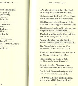 Hier meine nächste Anmerkung. Dein Hinweis auf Klopstock ist nicht nur für den ‚Nachtgesang‘ ein weiterer Aufschluss. Er ist auch für 12/11 interessant. Ich kenne Meyer-Kalkus’ Buch und schätze es auch. Aber bei einem Satz wie: „Wie mag eine so konzipierte rhythmische Deklamation wohl geklungen haben?“ weiß ich: er hat keine Ahnung! Ich könnte sie ihm vorsprechen. Aber er glaubt, das konnte nur Klopstock. Der 12/11 – Morgensterns graeco-latinische Übersetzung ist allerdings verkehrt rum: der 11/12 – hat etwas hymnisches, etwas odisches, etwas klopstockisches. Da ist ein absoluter Gleichschritt von v – v – v – v – in allen Zeilen, vierhebige Jamben, ein beschnittener Blankvers. Nicht ganz regelmäßig wechseln die Strophen: 1, 2, 3, 4, 6, 7, 11, 12 haben Zeilen, die Sätze sind, davon ist nur in 4 die zweite Zeile ein Satzäquivalent; in 5, 8, 9, 10 sind die Zeilen jeweils ein Syntagma, die Strophe bildet einen Satz. Als Sinnschritte kann man alle Zeilen sprechen, bei den Syntagmen-Zeilen spricht man schwebende Kadenz, bei den Satzzeilen fallende. Jede Strophe ist ein Ausspruch. Wegen der immer gleichen Silbenzahl ist das Tempo immer gleich. Die Betonungsstruktur ist interessant. Ich gebe Dir in der nächsten Mail eine Sprechpartitur. Und denke über Klangfarben, Lautstärken und Lautung nach, und über ‚Kra‘! lg n