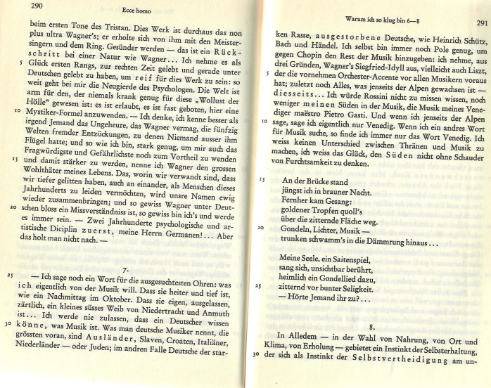Fisches Nachgesang ist eine gutgemeinte, v.a. obendrein gutgemachte Rettung dieses völlig überschätzten Dialektgedichts von Nietzsche. Wie sehr er gesächselt haben muss, lässt sich aus o.g. Zeilen erahnen … Mensch schreibt sich aber nunmal nicht mit ´Ü´. Schreib mir bitte noch etwas zum Unterschied zwischen Fröbe und Görner. Beide sind doch Schauspieler … warum kann der eine rezitieren, der andere nicht? Aus einer der Wohnungen hier in der Düttmannsiedlung blubbert selbstübte Hammondorgelmusik, gar nicht übel, es ist Sonntag, sonst wäre ich schon längst fertig, verzeih. Herzlich grüßt Konstantin