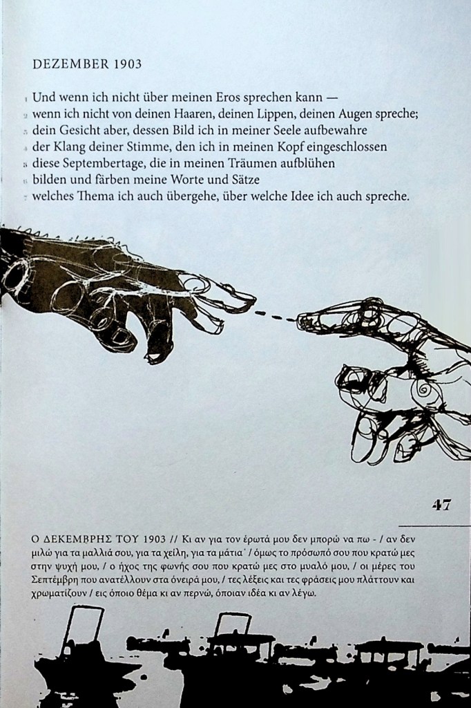 Aus: Konstantinos Kavafis, Im Verborgenen. Übersetzung Jorgos Kartakis & Jan Kuhlbrodt, Illustration Anja Nolte, Nachwort Ricardo Domeneck. Berlin: Verlagshaus J. Frank, 2014, S. 47
