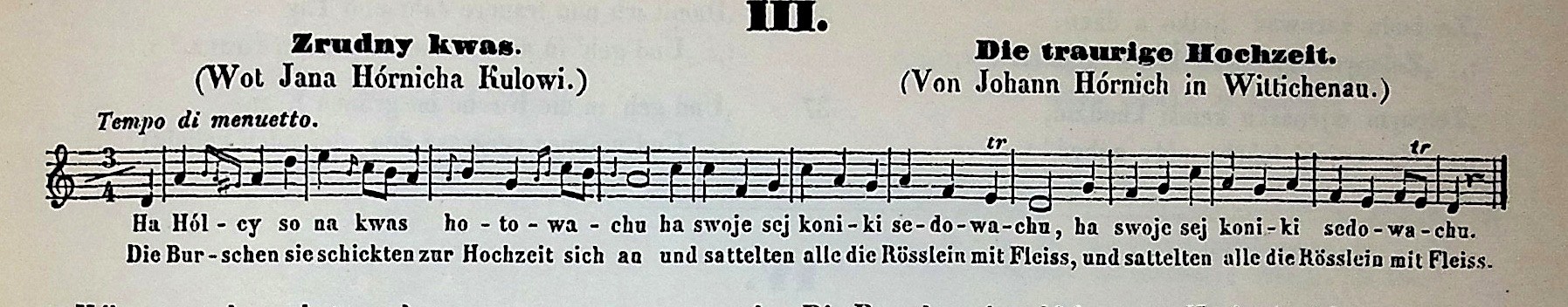 *) In der Sammlung von Leopold Haupt und Johann Ernst Schmaler (Hawptr u. Smoler) von 1841, nachgedruckt im Akademie Verlag 1953, steht das Volkslied in der Abteilung Feldlieder mit der Angabe: Gesammelt von Johann Woko in Kotten sowie unter Angabe einer Melodie (Abbildung unten mit anderem Text). Feldlieder (Pšezpólna) bedeutet: Lieder, welche beim Gange durchs Feld im Freien gesungen werden (Carmina peragraria). Der Inhalt muss auf die Zeit vom 9. – 12. Jahrhundert zurückgehen, während der die Deutschen nach harten Kämpfen die Sorben besiegten. Die deutsche Fassung dieser Anthologie trägt die Überschrift: Die Siege der Serben. Das war die Selbstbezeichnung der Obersorben.