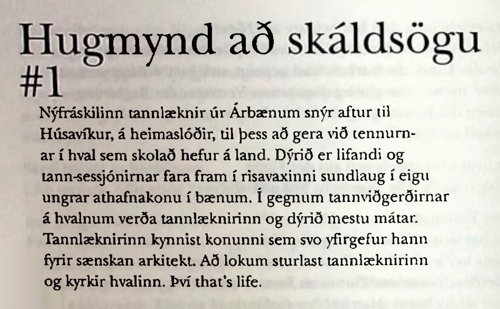 Idee zu einer Skaldensaga #1 Ein Zahnarzt, frisch geschieden, wohnhaft in den Vororten, fahrt heim nach Húsavík, um dort einem Wal, den es an Land geschwemmt hatte, die Zähne zu richten. Das Tier ist noch am Leben, die Zahnbehandlungen finden statt im Pool einer jungen hübschen Unternehmerin aus der Stadt. Bald darauf werden Wal und Zahnarzt, im Rahmen der Zahnbehandlung, beste Freunde. Zahnarzt nimmt Unternehmerin zur Frau. Frau lässt Zahnarzt sitzen, für einen Architekten aus Schweden. Da wird der Zahnarzt irre, würgt den Wal. So ist es halt, das Leben.