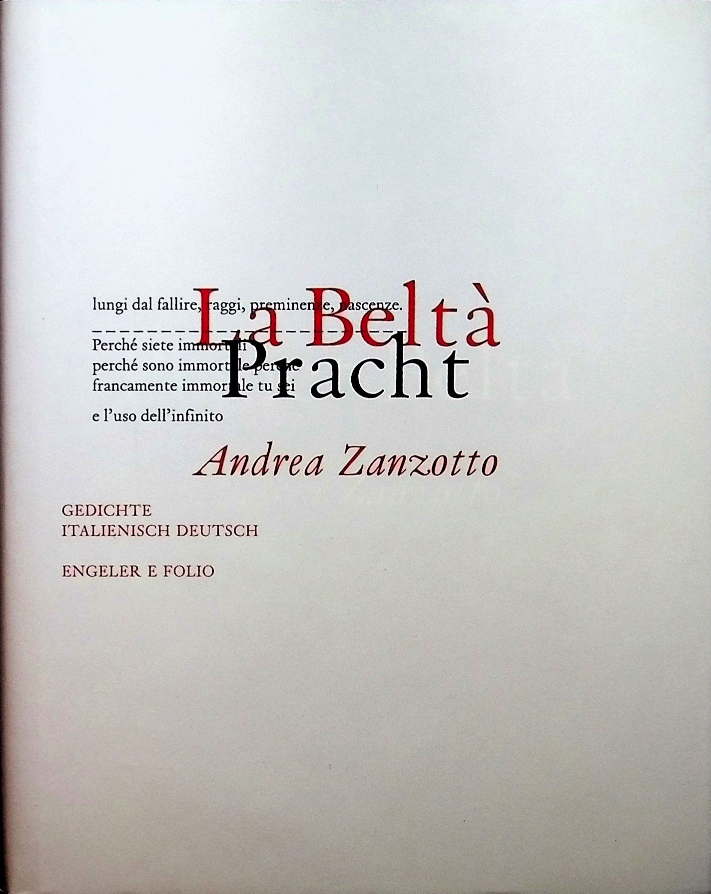 Aus: Andrea Zanzotto, La Beltà / Pracht. Gedichte Italienisch Deutsch mit einem Nachwort der Übersetzer. Hrsg./Übers. Donatella Capaldi, Maria Fehringer, Ludwig Paulmichl und Peter Waterhouse. Band I. S. 47 / 65.