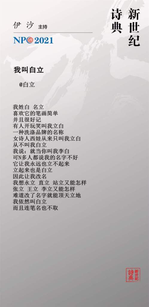 NPC steht für New Poetry Canon, eigentlich New Century Poetry Canon, 新世纪诗典. Abgekürzt als NPC. NPC steht sonst für National People’s Congress, also der Nationale Volkskongress, Chinas Parlament, das allerdings nur einmal im Jahr im März zwei Wochen lang zusammentritt. Seit 2011 wird von Yi Sha 伊沙 im NPC-新世纪诗典 jeden Tag ein Gedicht vorgestellt, in mehreren chinesischen sozialen Medien zugleich. Oft wird ein einziges Gedicht schon in den ersten zwei Tagen zehntausende Male angeklickt, kommentiert und weitergeleitet. Ein nationaler Poesiekongress und eine umfangreiche Studie der heutigen Gesellschaft.