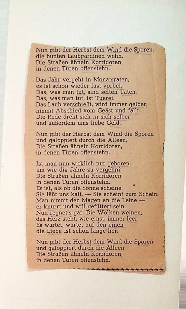 Heute schlage ich auf: Das Gedicht. Jahrbuch zeitgenössischer Lyrik 1954/55. Herausgegeben von Rudolf Ibel, erschienen 1954 im Christian Wegner Verlag Hamburg. Die immer noch lesenswerte Anthologie (das ist keine Selbstverständlichkeit) hat außer ein paar Markierungen einzelner Texte mit Kreuzchen keine Lesepuren. Aber es liegt ein Zeitungsausschnitt darin. Vorbesitzer hat ein Gedicht ausgeschnitten, allerdings ohne den Titel. Es handelt sich um das Gedicht „Herbst auf der ganzen Linie“ von Erich Kästner von 1936, das ich in einer etwas längeren Version kenne.