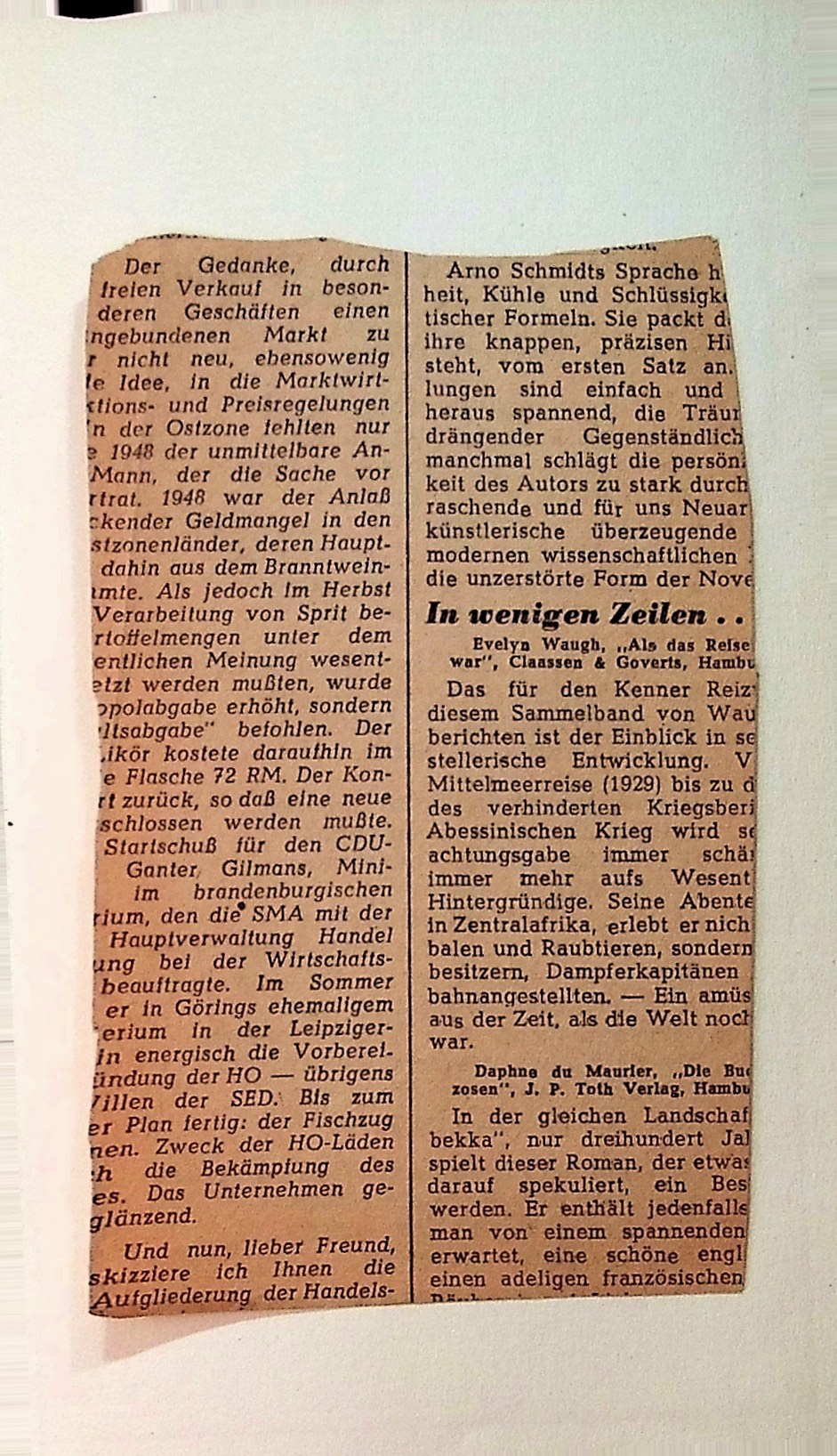 An dem Zeitungsausschnitt interessiert mich die Rückseite beinah noch mehr. Es gibt einen Artikel über die ostdeutsche (in der Sprache der Zeitung: ostzonale) Handelsorganisation HO und einen über Arno Schmidt, beide leider willkürlich angeschnitten. Die letzte Zeile des Artikels über einen meiner Lieblingsautoren lautet: „die unzerstörte Form der Nove[lle]“. Es ist eine westdeutsche Zeitung, vielleicht „Die Welt“ (nur geraten), von Ende der 40er oder Anfang der 50er Jahre.