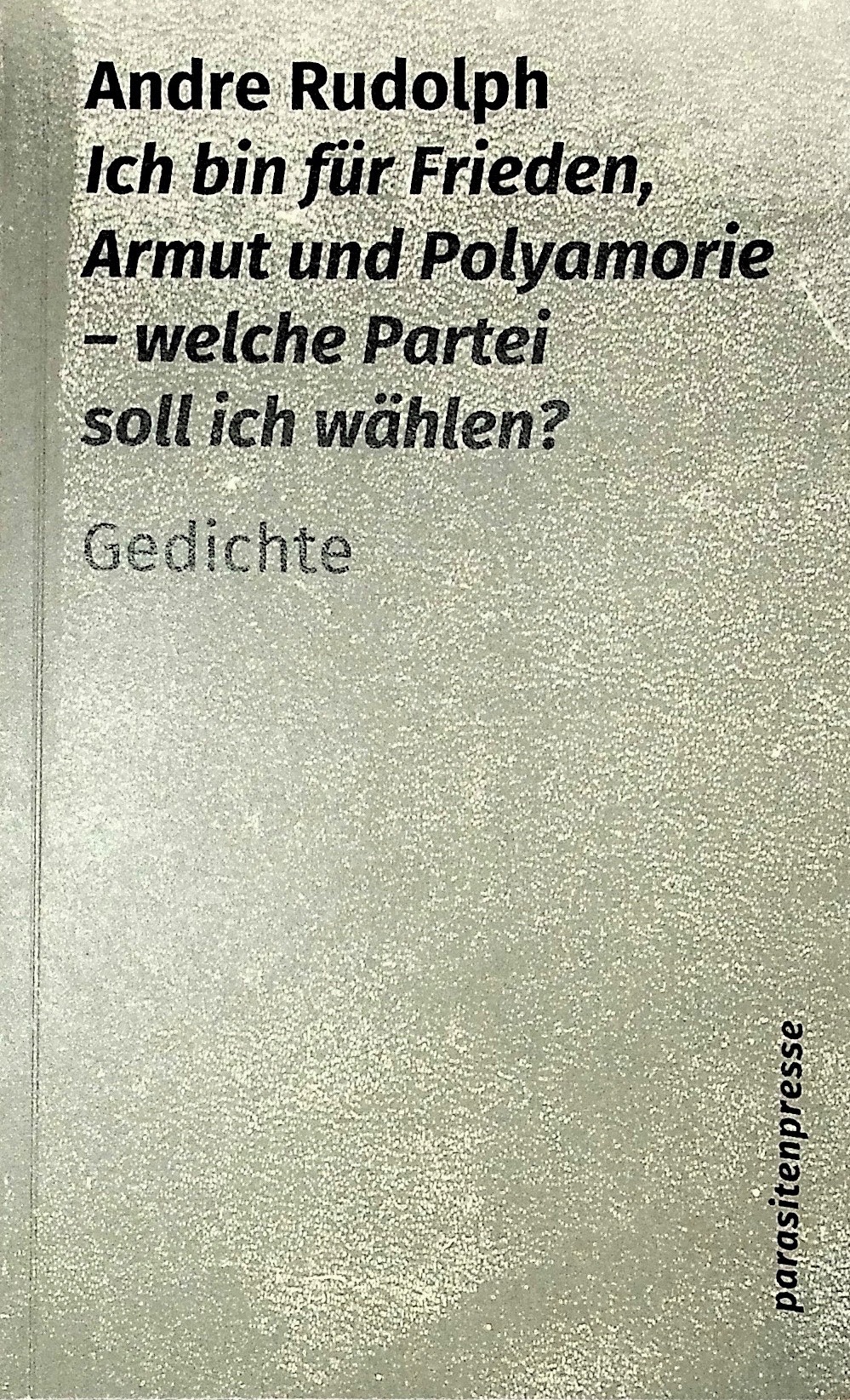 Aus: Andre Rudolph: Ich bin für Frieden, Armut und Polyamorie – welche Partei soll ich wählen? Gedichte. Köln: parasitenpresse, 2020, S. 15ff