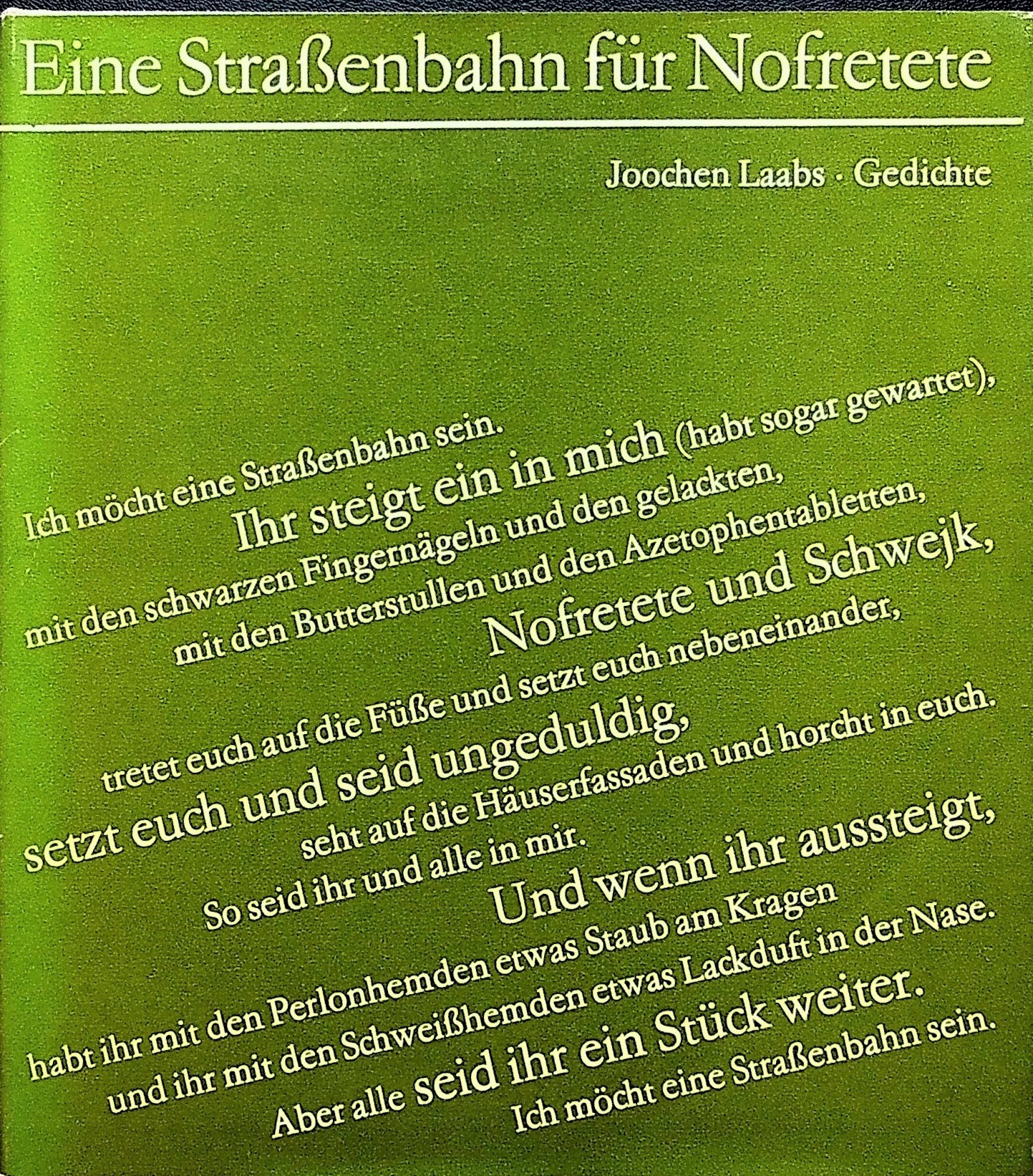 Aus: Joochen Laabs, Eine Straßenbahn für Nofretete. Gedichte. Halle: Mitteldeutscher Verlag, 1970, S. 40