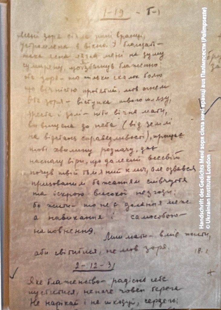 Handschrift, Original und Übersetzung eines Gedichts des ukrainischen Dichters Wassyl Stus, der 1985 in einem sowjetischen Straflager starb und dessen Haft nicht einmal durch seinen Tod verbüßt war.