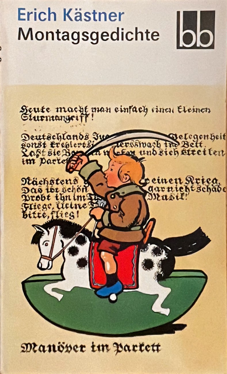 Aus: Kästner, Erich, Montagsgedichte. Zusammengestellt und kommentiert von Alexander Fiebig. Berlin : Aufbau-Verl., 1989 (1. Aufl.), S. 5f – Das Taschenbuch in der bb-Reihe des Ostberliner Aufbau-Verlags gibt an: „Ausgabe für die Deutsche Demokratische Republik mit Genehmigung des Atrium-Verlages, Zürich“. Jedoch lässt sich bei der Deutschen Nationalbibliothek keine frühere Ausgabe des Titels ermitteln, die DNB listet vielmehr diese Aufbau-Ausgabe zuerst. Erst 2012 erschien eine Buchausgabe bei Atrium „Die MontagsGedichte / Erich Kästner. Mit einem Vorw. von Marcel Reich-Ranicki. Kommentiert von Jens Hacke“ und zugleich ein Hörbuch (CD) , die als Erstausgabe bezeichnet wird. Vielleicht weiß jemand aus der Leserschaft mehr darüber?