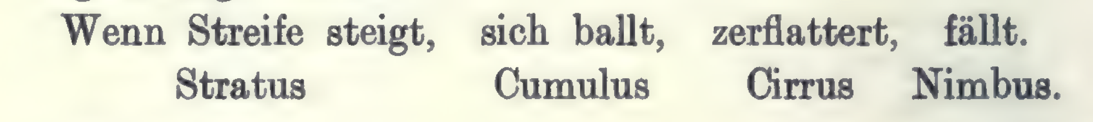 Die erste Strophe handelt von poetischen Versuchen, dem „ungebildeten Zufälligen“ der Wolkenbildung eine bestimmte Form zu geben (in einem Kommentar nennt er Shakespeare und den indischen Dichter Kalidasa). Die zweite Strophe beschreibt Howards Wolkenlehre. Ich mache auf die vorletzte Zeile aufmerksam und reiche darunter Goethes Kommentar zu dieser Zeile nach.