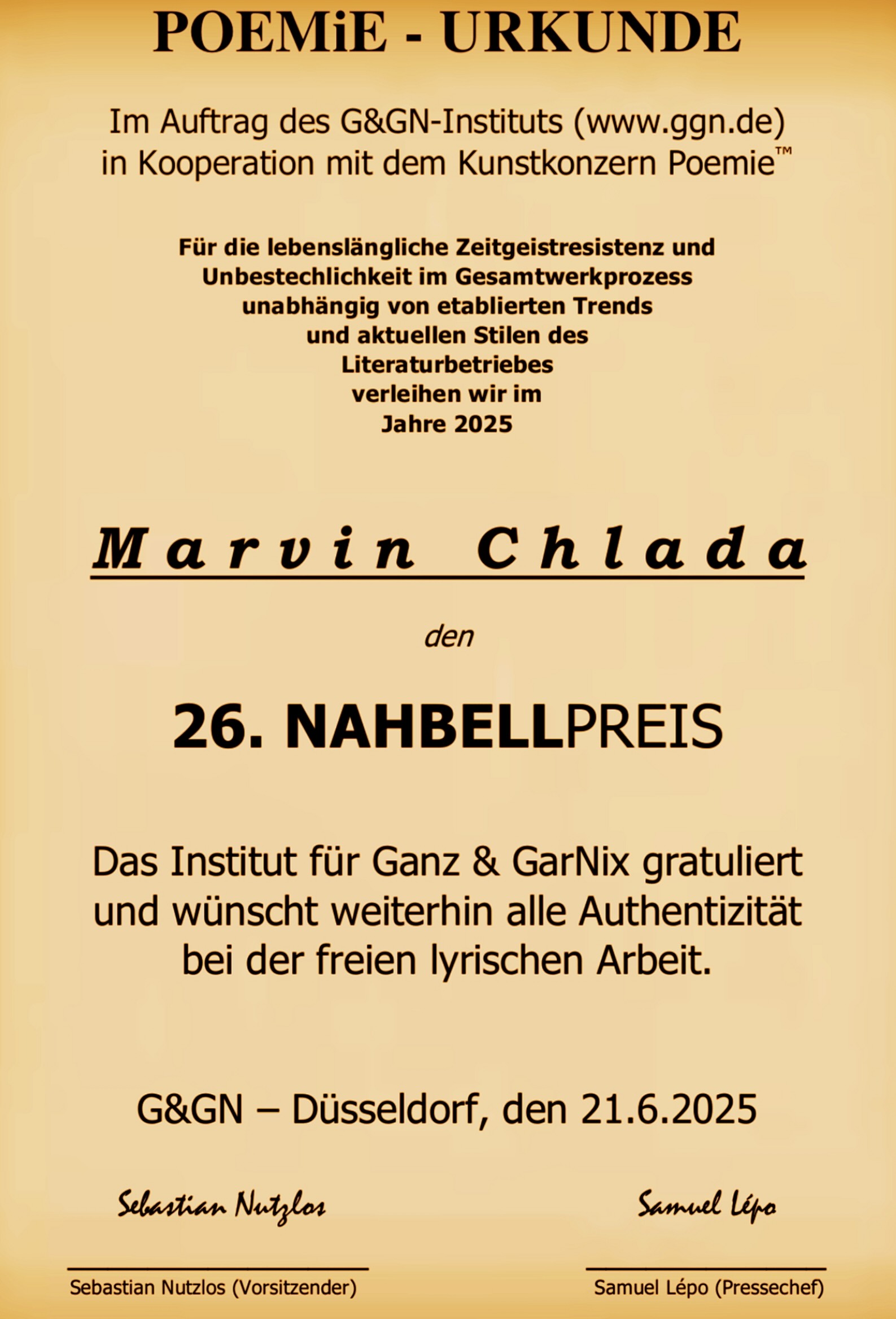 G&GN-INSTITUT Düsseldorf, den 21. Juni / Der 26. Nahbellhauptpreis 2025 geht an den Duisburger Dichter Marvin Chlada. Dieses Jahr konnten alle drei weiteren Preise: der Nahbellförderpreis (für Lyrik-Newcomer) der Nahbellnebenpreis (für den unerwarteten Essay) und der Nahbellkonzeptpreis (für engagierte Kulturprojekte) nicht vergeben werden. Um rechtzeitige Bewerbungen für das kommende Jahr wird gebeten. Hier nun ein Auszug aus dem aktuellen Nahbellpreis-Interview „WORTALCHEMIE IM DIGITALEN ZEITALTER: SUBVERSION OHNE SPRENGKRAFT“ (13 Fragen/Antworten) zwischen G&GN (De Toys) und Chlada: