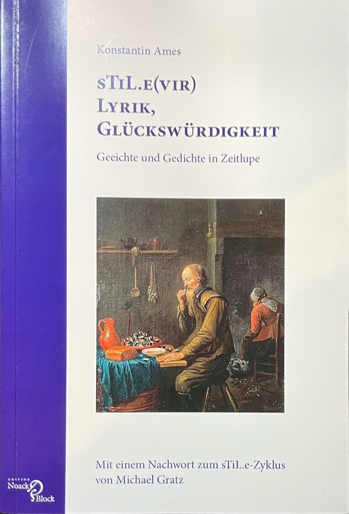 Aus: Konstantin Ames: sTiL.e(vir) Lyrik, Glückswürdigkeit — Geeichte und Gedichte in Zeitlupe. Berlin (Edition Noack & Block) 2021. 116 Seiten. 14,80 Euro.