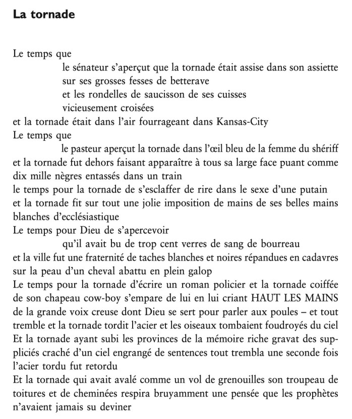 Pamphlete IV die schlechte Zeit paart sich mit der neuen Zeit und zeugt alte Meinungen schreckliche Erinnerungen gehen mit leeren Händen umher im Frauenfunk wird Nietzsche widerlegt Adolf Hitler ist eine Figur von Michaux man trägt Familie Ministervergangenheiten kokettieren über die lachenden Gesichter wandern langsam die Schattensäulen der H-Bomben-Explosionen Automodelle bewegen sich stellvertretend durch vergleichsweise Gegenden die neue Zeit geht auf und unter wie der Abendstern im September